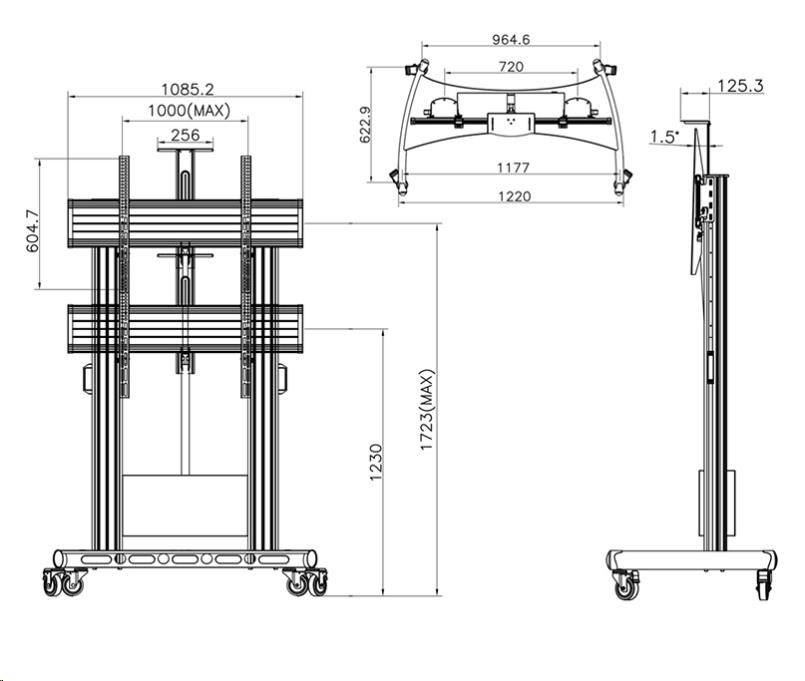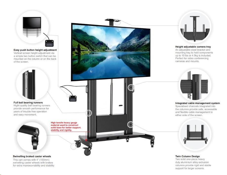 Technické údaje: •nosnost 136,4kg •podporuje VESA standardy 200x200 až 1000x600 •doporučená úhlopříčka 55" až 100" •motorizovaný - plynulé nastavení výšky obrazovky •nastavitelná výška 130 až 170cm (po střed obrazovky) •horní polička na kameru nebo projektor - odnímatelná •systém vedení kabeláže •IR ovládání •stabilní podstava osazena pojezdovými kolečky s brzdou •nejvyšší bezpečnost •spolehlivost •záruka 3 roky Motorizovaný Tv stojan Fiber Mounts TW100 podporuje VESA standardy: •VESA 200x200 •VESA 300x200 •VESA 300x300 •VESA 400x200 •VESA 400x300 •VESA 400x400 •VESA 600x400 •VESA 800x400 •VESA 800x600 •VESA 1000x400 •VESA 100.