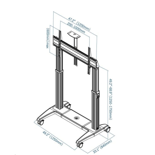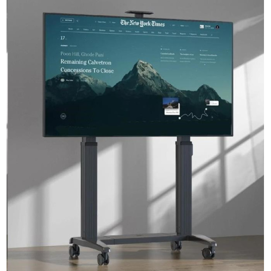rofesionální Tv stojan NB GF150 Profesionální motorizovaný stojan na Tv 60" - 120", elektrické nastavení výšky 1250-1750 mm, nastavení výšky obrazovky na panelu nebo dálkovým ovládáním, zásuvka na připojení Tv, 2 výkonné 150W motory, horní polička 255x130 mm, kolečka s aretací, podporované VESA standardy 200x200 až 1000x600, nosnost 136 kg Motorizovaný profesionální televizní stojan nejvyšší kvality a v kráném designu. Stojan je ideální na televize, displeje, dotykové obrazovky nebo monitory s úhlopříčkou od 60" až do 120". Umožní vám velmi snadno nastavit přesnou výšku obrazovky buď na ovládacím panelu umístěném na sloupku stojanu nebo dálkovým ovládáním. Možnost uložení 3 výšek do paměti stojanu. V horní části stojanu je integrovaná zásuvka na připojení obrazovky - není tedy nutné připojit do el. sítě zvlášť stojan a zvlášť obrazovku - připojením stojanu budete zároveň napájet i připojené zařízení, navíc není potřeba řešit dostatečnou délku přívodního kabelu. Stojan je dodáván včetně horní police pro umístění příslušenství (kamera, projektor, mini pc apod.) s rozměry 255x130 mm. Tělo stojanu je z hliníku, závěsný systém je ocelový. Podstava stojanu je osazena 4 otočnými kolečky s možností aretace. Stojan má systém pro vedení kabeláže. Tv stojan NB GF150G Technické údaje: nosnost 136,4 kg podporuje VESA standardy od 200x200 až do 1000x600 idální na Tv, monitory, dotykové obrazovky a displeje s úhlopříčkou 60" až 120" minimální výška 1250mm (střed obrazovky) maximální výšky 1750mm (střed obrazovky) elektrické nastavení výšky ovládáním na stojanu nebo dálkovým ovladačem 2 silné 150W motory rozměry podstavy stojanu 1250x840 mm 4 otočná kolečka s aretací systém pro vedení kabeláže na stojanu je integrovaná zásuvka pro napájení obrazovky nejvyšší kvalita, precizní zpracování, krásný design záruka 3 roky.