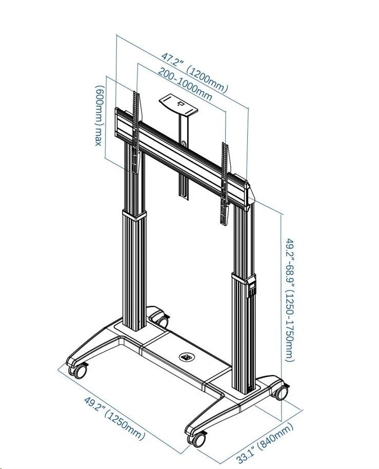 rofesionální Tv stojan NB GF150 Profesionální motorizovaný stojan na Tv 60" - 120", elektrické nastavení výšky 1250-1750 mm, nastavení výšky obrazovky na panelu nebo dálkovým ovládáním, zásuvka na připojení Tv, 2 výkonné 150W motory, horní polička 255x130 mm, kolečka s aretací, podporované VESA standardy 200x200 až 1000x600, nosnost 136 kg Motorizovaný profesionální televizní stojan nejvyšší kvality a v kráném designu. Stojan je ideální na televize, displeje, dotykové obrazovky nebo monitory s úhlopříčkou od 60" až do 120". Umožní vám velmi snadno nastavit přesnou výšku obrazovky buď na ovládacím panelu umístěném na sloupku stojanu nebo dálkovým ovládáním. Možnost uložení 3 výšek do paměti stojanu. V horní části stojanu je integrovaná zásuvka na připojení obrazovky - není tedy nutné připojit do el. sítě zvlášť stojan a zvlášť obrazovku - připojením stojanu budete zároveň napájet i připojené zařízení, navíc není potřeba řešit dostatečnou délku přívodního kabelu. Stojan je dodáván včetně horní police pro umístění příslušenství (kamera, projektor, mini pc apod.) s rozměry 255x130 mm. Tělo stojanu je z hliníku, závěsný systém je ocelový. Podstava stojanu je osazena 4 otočnými kolečky s možností aretace. Stojan má systém pro vedení kabeláže. Tv stojan NB GF150G Technické údaje: nosnost 136,4 kg podporuje VESA standardy od 200x200 až do 1000x600 idální na Tv, monitory, dotykové obrazovky a displeje s úhlopříčkou 60" až 120" minimální výška 1250mm (střed obrazovky) maximální výšky 1750mm (střed obrazovky) elektrické nastavení výšky ovládáním na stojanu nebo dálkovým ovladačem 2 silné 150W motory rozměry podstavy stojanu 1250x840 mm 4 otočná kolečka s aretací systém pro vedení kabeláže na stojanu je integrovaná zásuvka pro napájení obrazovky nejvyšší kvalita, precizní zpracování, krásný design záruka 3 roky.