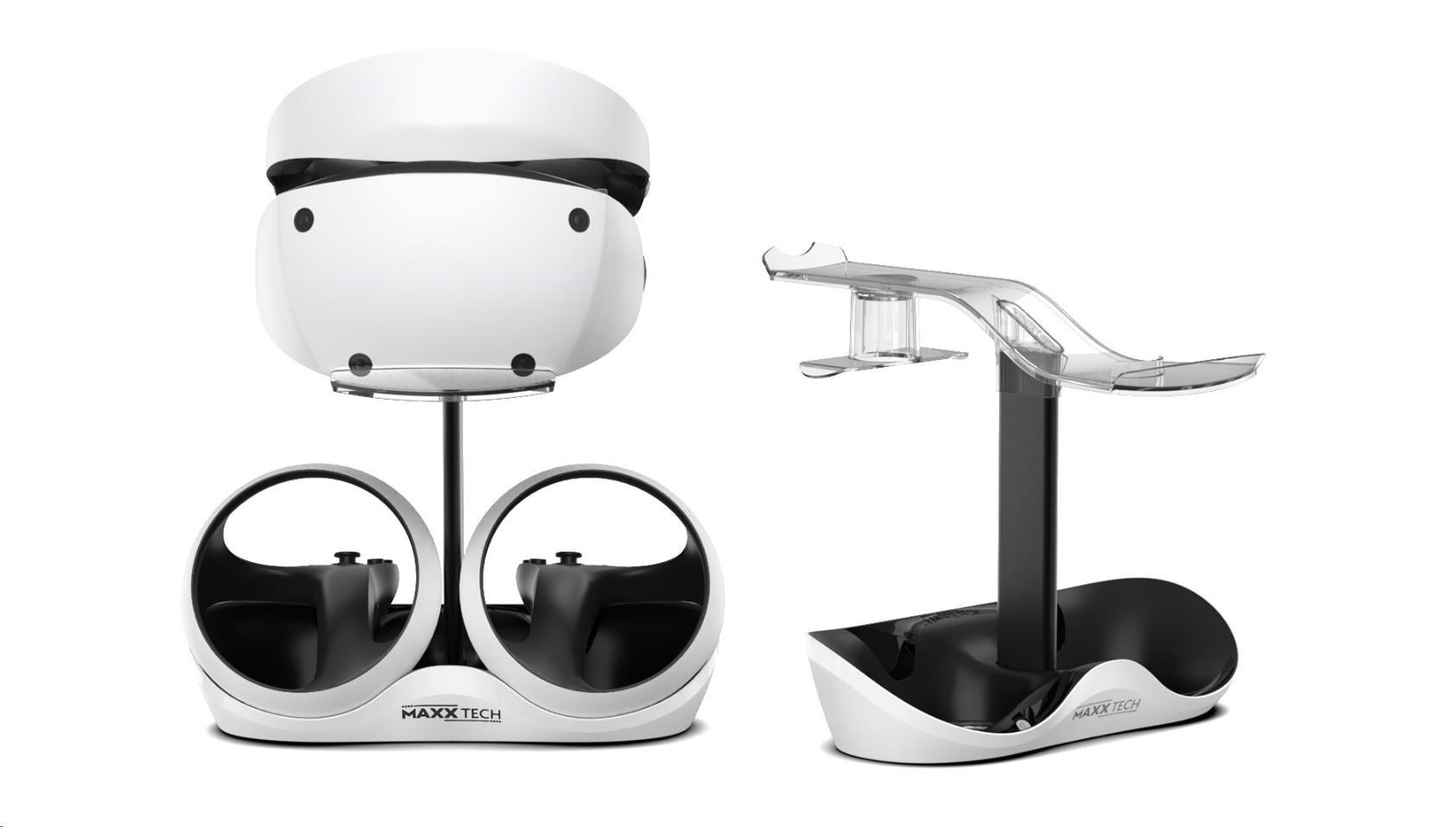 Maxx Tech LED Charging Stand – speciálně navržený pro PSVR2. Nabíjí oba ovladače PSVR 2 najednou díky diskrétním magnetickým nabíjecím adaptérům. Obsahuje stojan na headset, na kterém si můžete headset PSVR2 vystavit, zatímco se vám budou ovladače nabíjet.
