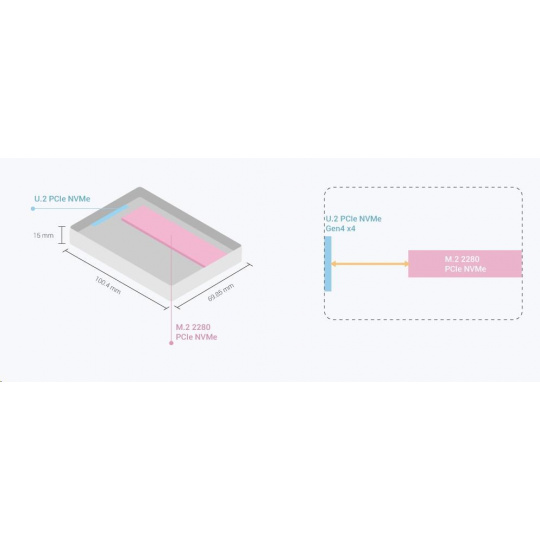 Produkt QDA-UMP4 umožňuje instalovat jeden M.2 PCIe 4.0 x4 NVMe SSD do 2,5” diskové pozice U.2 (SFF-8639) PCIe 4.0 x4 NVMe SSD. Pro zařízení QDA-UMP4 není potřeba žádný další software ani ovladače a lze jej nainstalovat do počítače/pracovní stanice (Windows®, Linux®) nebo QNAP NAS, aby bylo možné používat disky M.2 SSD jako cenově výhodnou alternativu drahých disků U.2 SSD.