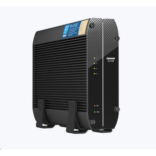 Profesionální zařízení 2,5GbE NAS TS-410E je navrženo pro provoz v prostředí citlivém na hluk. Díky konstrukci bez ventilátoru a pevnému šasi lze TS-410E umístit ve svislé poloze a ušetřit tak místo na pracovním stole. SSD cache lze také nakonfigurovat pro vysokorychlostní I/O, aby se urychlily a vynikly náročné aplikace.