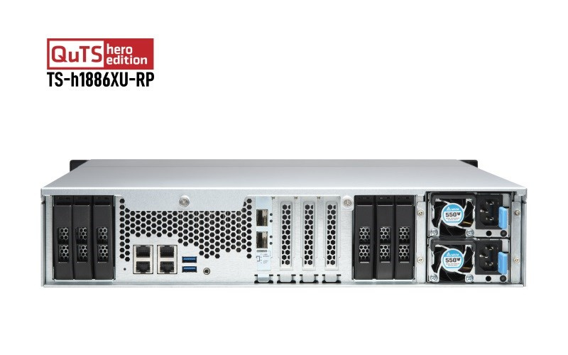 Zařízení TS-h1886XU-RP R2 2U s montáží do racku má dvanáct 3,5" diskových pozic SATA 6Gb/s, šest 2,5" slotů SATA 6Gb/s SSD, podporuje konektivitu 10GbE a čtyř 2,5GbE a je vybaveno čtyřjádrovým procesorem Intel® Xeon® D-1622 s pamětí až 128 GB DDR4 ECC (Error Correcting Code). S operačním systémem QuTS hero na bázi ZFS dosahuje TS-h1886XU-RP R2 výkonu serverové třídy a vysoké spolehlivosti. Ať už jde o souborové servery s kritickým významem, virtualizační servery, kolaborativní úpravy videí nebo efektivní aplikace pro zálohování a obnovu dat, zařízení TS-h1886XU-RP R2 s tříletou zárukou nabízí vysoce výkonné a zároveň cenově výhodné řešení NAS.