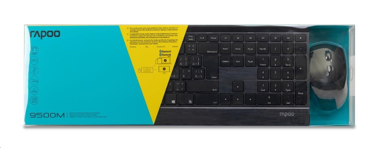 Tato ultratenká sada myši a klávesnice nabízí špičkové materiály se stylovým designem a komfortem užívání. Tělo klávesnice vyrobené z nerezové oceli a hliníkové slitiny je nejen pevné a odolné, ale zároveň dodává pracovnímu stolu určitý styl. Sada 9500M je nejen vyspělá konstrukcí, ale také funkcionalitou. Nabízí vícerežimovou technologii připojení firmy Rapoo – prostřednictvím spolehlivého bezdrátového vysílače 2,4 GHz, Bluetooth 3.0 a 4.1 – umožňuje současné připojení a přepnutí několika zařízení (s automatickým párováním). Myš v této sadě je vybavena plně nastavitelným vysoce výkonným optickým senzorem 600 až 1600 DPI. Navíc energeticky úsporná technologie firmy Rapoo zajišťuje životnost baterií až 12 měsíců, takže minimalizuje potřebu jejich výměny.