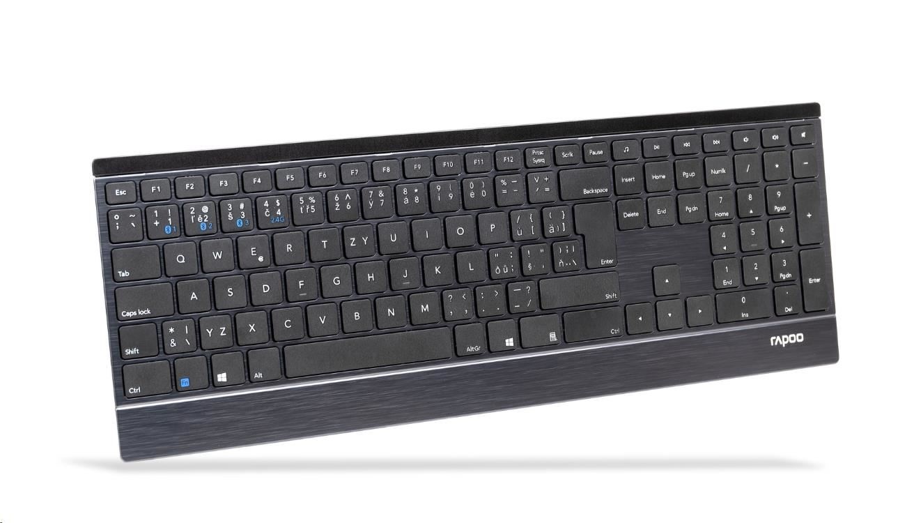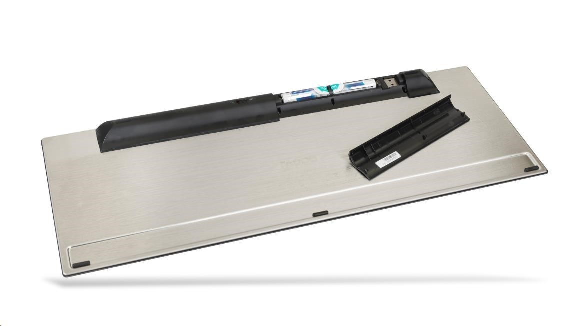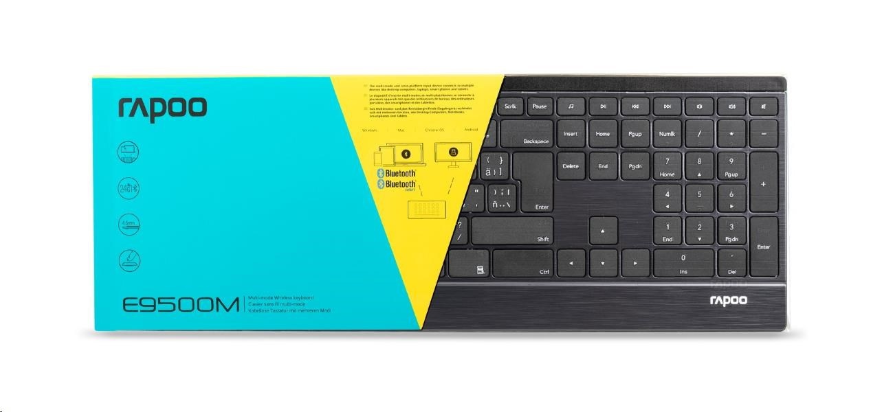 Tato ultratenká klávesnice spojuje prvotřídní materiály se stylovým designem. Tělo klávesnice vyrobené z nerezové oceli a hliníkové slitiny je nejen pevné a odolné, ale zároveň dodává pracovnímu stolu určitý styl. Klávesnice E9500M je nejen vyspělá konstrukcí, ale také funkcionalitou. Nabízí vícerežimovou technologii připojení firmy Rapoo – prostřednictvím spolehlivého bezdrátového vysílače 2,4 GHz, Bluetooth 3.0 a 4.1 – umožňuje současné připojení a přepnutí několika zařízení (s automatickým párováním). Navíc energeticky úsporná technologie firmy Rapoo zajišťuje životnost baterií až 12 měsíců, takže minimalizuje potřebu jejich výměny.