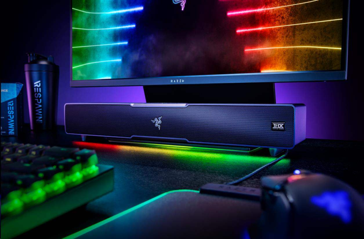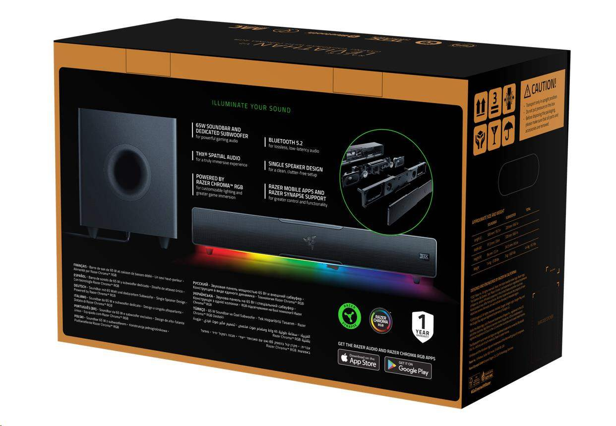 | OTHERS | Razer Chroma™ RGB (18 zones) THX Spatial Audio (PC based via Synapse 3) Bluetooth 5.2 (60ms low latency) USB audio input Razer Audio app Razer Chroma RGB app Custom 10-band EQ Raised feet on soundbar Headphone quick toggle Dimensions: Soundbar: 19.7 x 3.6 x 3.3" / 500 x 91.3 x 84 mm Subwoofer: 8.67 x 8.67 x 9.5" / 220 x 220 x 241.5 mm |