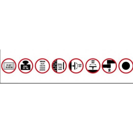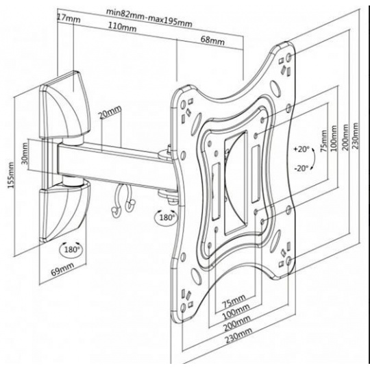 Nástěnný ocelový držák na LCD monitory a TV s uhlopříčkou 23"- 42" (58-107cm) a hmotností maximálně 20kg. 2x pant, vertikálně výklopný +20°/-20° a horizontálně otočný +90°/-90°, vzdálenost od stěny 82-195mm, materiál ocel, barva černá. Uchycení VESA: 75x75, 100x100, 100x200, 200x200..