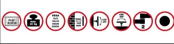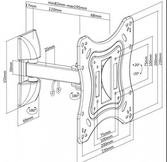 Nástěnný ocelový držák na LCD monitory a TV s uhlopříčkou 23"- 42" (58-107cm) a hmotností maximálně 20kg. 2x pant, vertikálně výklopný +20°/-20° a horizontálně otočný +90°/-90°, vzdálenost od stěny 82-195mm, materiál ocel, barva černá. Uchycení VESA: 75x75, 100x100, 100x200, 200x200..