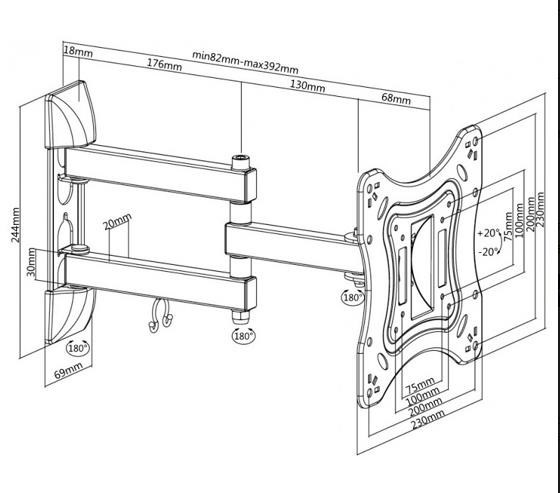 Nástěnný ocelový držák na LCD monitory a TV s uhlopříčkou 23"- 42" (58-107cm) a hmotností maximálně 20kg. 3x pant, vertikálně výklopný +20°/-20° a horizontálně otočný +90°/-90°, vzdálenost od stěny 82-392mm, materiál ocel, barva černá. Uchycení VESA: 75x75, 100x100, 100x200, 200x200..