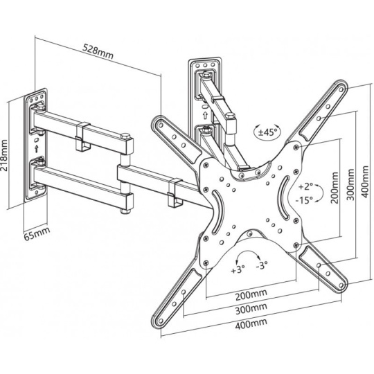 Nástěnný ocelový držák do rohu místnosti na LCD monitory a TV s uhlopříčkou 23"- 55" (58-140cm) a hmotností maximálně 45kg. 2x2 panty, vertikálně výklopný +2°/-15° a horizontálně otočný +45°/-45°, pro Curved TV, Cable Managment, materiál ocel, barva černá. Uchycení VESA: 100x200, 200x200, 300x200, 300x300, 400x200, 400x300, 400x400..