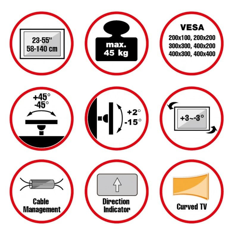 Nástěnný ocelový držák do rohu místnosti na LCD monitory a TV s uhlopříčkou 23"- 55" (58-140cm) a hmotností maximálně 45kg. 2x2 panty, vertikálně výklopný +2°/-15° a horizontálně otočný +45°/-45°, pro Curved TV, Cable Managment, materiál ocel, barva černá. Uchycení VESA: 100x200, 200x200, 300x200, 300x300, 400x200, 400x300, 400x400..