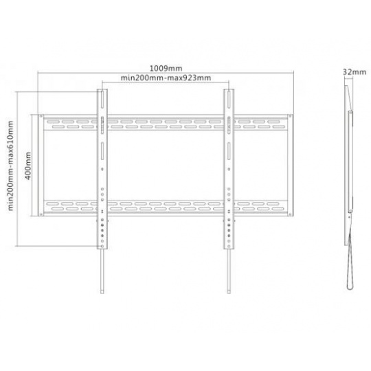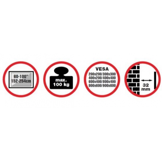 Nástěnný ocelový držák na Plasma a LCD TV s uhlopříčkou 60"- 100" (152-254cm) a hmotností maximálně 100kg. Konzole na zavěšení TV s vodováhou, není vertikálně výklopný, vzdálenost od stěny 32mm, materiál ocel, Click-in system, barva černá. Uchycení VESA: 200x200, 400x200, 300x300, 400x400, 600x400, 800x400, 800x600, 900x600..