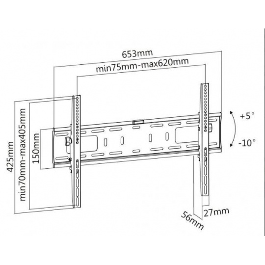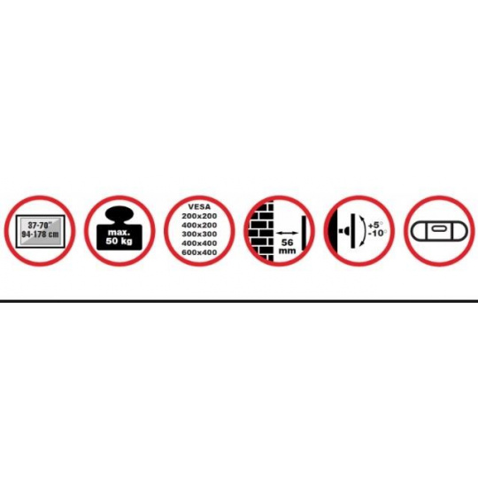 Nástěnný ocelový držák na Plasma a LCD TV s uhlopříčkou 37"- 70" (94-178cm) a hmotností maximálně 50kg. Konzole na zavěšení TV s vodováhou, vertikálně výklopný +5°/-10°, vzdálenost od stěny 56mm, materiál ocel, cenově výhodné, barva černá. Uchycení VESA: 200x200, 400x200, 300x300, 400x400, 600x400..
