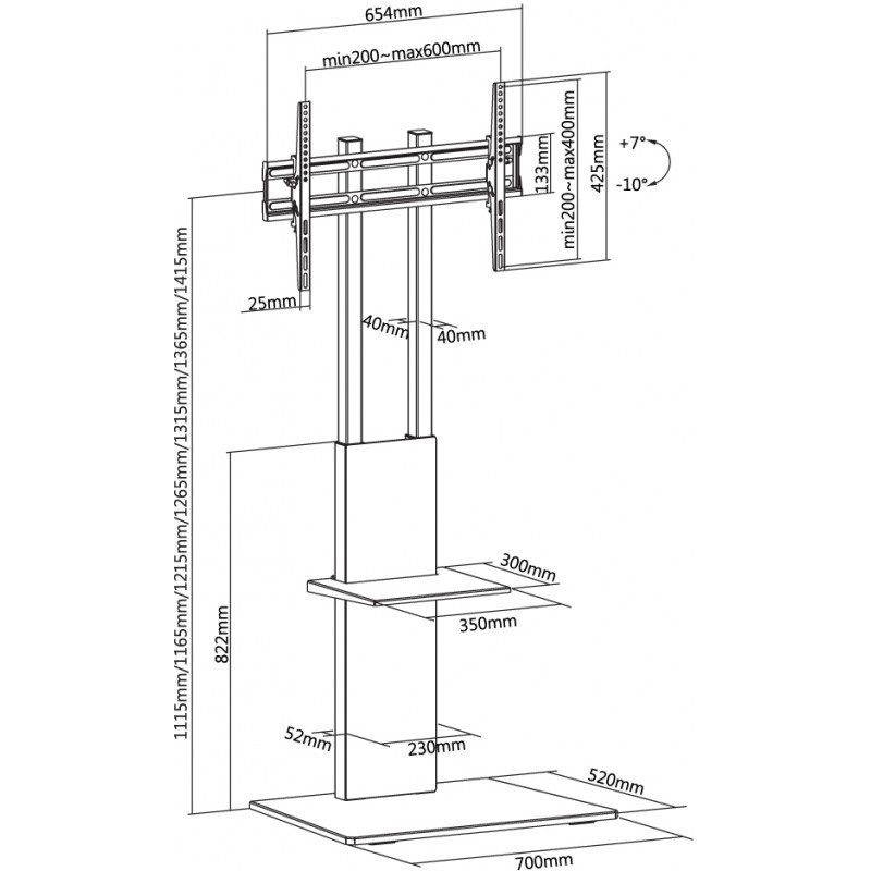 Designový stolek na velké LCD TV s uhlopříčkou 37"- 70" (94-178cm) a hmotností maximálně 40kg. Středový nosný profil 111,5-141,5cm na elegantní základní desce, držák výklopný +7°/-10°, polička 30x35cm max 5kg, ocelová konstrukce až ke zdi, rozměr 70x52x161,8cm, barva černá. Uchycení VESA: 200x200, 300x200, 300x300, 400x200, 400x300, 400x400, 600x400..