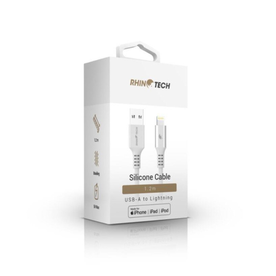 Kvalitní RhinoTech datový a nabíjecí MFi kabel z odolného nylonového materiálu s konektory USB-A na Lightning o délce 1,2m v elegantní stříbrné barvě.