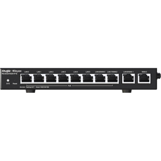 Registrace dealerské ceny: https://docs.google.com/forms/d/1sWwsswsbBk36eZx4CJrfl47qUvrORQyYz7kMjrt2f_c/prefill Popis produktu Ruijie RG-EG310GH-P-E je kabelový Gigabitový router s PoE, dostatečným VPN výkonem pro obsloužení poboček a vzdáleně pracujících pracovníků v rámci firmy. Bezpečný a spolehlivý router s vlastním webovým managementem, možností správy přes Ruijie Cloud odkudkoliv, blokování obsahu podle typu aplikace, inteligentní Multi-WAN load balancing s možností využít až 4 WAN porty zároveň. Router nabízí 1 Gigabitovými WAN port, 6x Gigabit LAN, 3 Gigabitový LAN/WAN porty, celkový výkon v NATu 1.5 Gbps a 802.3af/at PoE na prvních 8 portech s celkovým PoE budgetem 130W. Router pro přístup do lokální sítě umožňuje i několik možností VPN serverů a to konkrétně: IPsec, PPTP, L2TP a OpenVPN. Limity VPN • IPsec: 230 Mbps, max. 64 tunelů • L2TP: 640 Mbps, max. 64 tunelů • OpenVPN: 100 Mbps, max. 64 tunelů Obsah balení • Zařízení • Napájecí adaptér 52V / 2.4A • Napájecí kabel Technické parametry Konektory a rozhraní Rychlosti WAN:(1) 10/100/1000Mbps Možnost více WAN:Ano Rychlost LAN:(6) 10/100/1000Mbps + (3) 10/100/1000Mbps LAN/WAN Gigabit LAN:Ano Napájení Typ napájení:DC konektor Typy PoE:PoE-Out (pouze) Podporované PoE-Out standardy:802.3af, 802.3at Počet PoE Out portů:8 PoE budget [W]:110 Max. spotřeba energie [W]:130 Napájení přes konektor/svorkovnici:54V / 2,4A Fyzické charakteristiky Provedení:Desktop Ventilátory:Bez ventilátoru Šasi:Kovové Tlačítka:Reset Provozní teplota [°C]:0 až 40 Šířka [mm]:202 Výška [mm]:28 Hloubka [mm]:108 Hardware Frekvence CPU [MHz]:1350 Počet CPU jader:2 Obecné Propustnost NAT [Mb/s]:1500 Propustnost VPN IPsec VPN [Mb/s]:230 Software Podporované VPN:PPTP, L2TP, IPSec, OpenVPN Web management:Ano Management:Webové rozhraní, Ruijie cloud Podpora IPv6:Ano Výchozí IP adresa:192.168.110.1 Výchozí jméno a heslo:Nastavuje se při prvním spuštění.