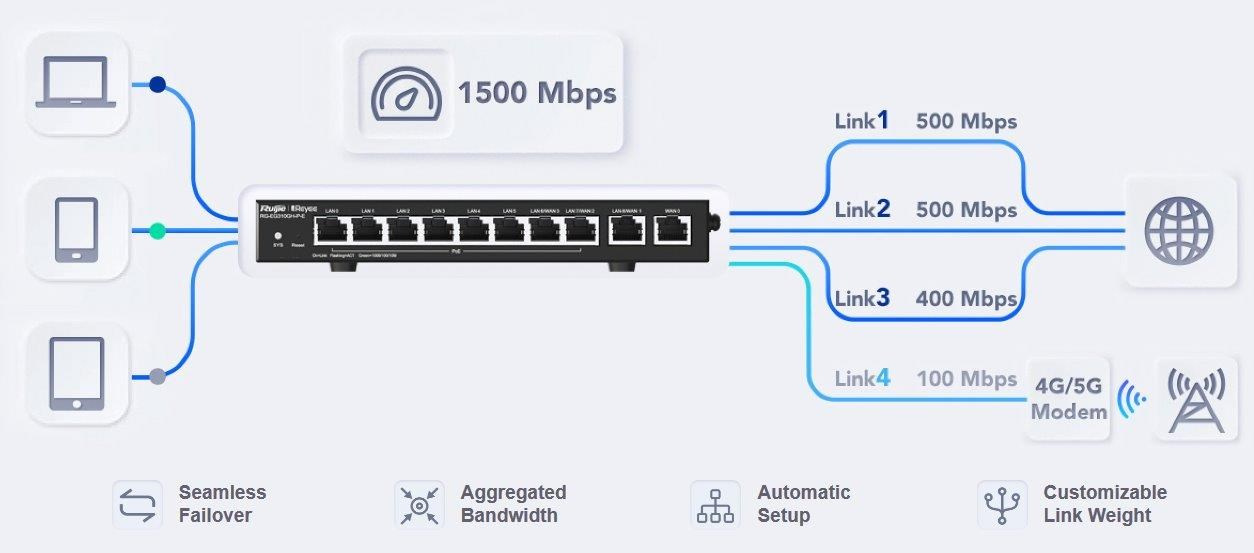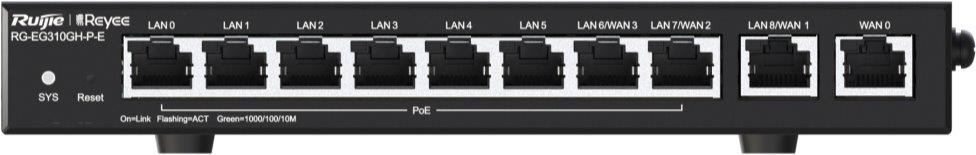 Registrace dealerské ceny: https://docs.google.com/forms/d/1sWwsswsbBk36eZx4CJrfl47qUvrORQyYz7kMjrt2f_c/prefill Popis produktu Ruijie RG-EG310GH-P-E je kabelový Gigabitový router s PoE, dostatečným VPN výkonem pro obsloužení poboček a vzdáleně pracujících pracovníků v rámci firmy. Bezpečný a spolehlivý router s vlastním webovým managementem, možností správy přes Ruijie Cloud odkudkoliv, blokování obsahu podle typu aplikace, inteligentní Multi-WAN load balancing s možností využít až 4 WAN porty zároveň. Router nabízí 1 Gigabitovými WAN port, 6x Gigabit LAN, 3 Gigabitový LAN/WAN porty, celkový výkon v NATu 1.5 Gbps a 802.3af/at PoE na prvních 8 portech s celkovým PoE budgetem 130W. Router pro přístup do lokální sítě umožňuje i několik možností VPN serverů a to konkrétně: IPsec, PPTP, L2TP a OpenVPN. Limity VPN • IPsec: 230 Mbps, max. 64 tunelů • L2TP: 640 Mbps, max. 64 tunelů • OpenVPN: 100 Mbps, max. 64 tunelů Obsah balení • Zařízení • Napájecí adaptér 52V / 2.4A • Napájecí kabel Technické parametry Konektory a rozhraní Rychlosti WAN:(1) 10/100/1000Mbps Možnost více WAN:Ano Rychlost LAN:(6) 10/100/1000Mbps + (3) 10/100/1000Mbps LAN/WAN Gigabit LAN:Ano Napájení Typ napájení:DC konektor Typy PoE:PoE-Out (pouze) Podporované PoE-Out standardy:802.3af, 802.3at Počet PoE Out portů:8 PoE budget [W]:110 Max. spotřeba energie [W]:130 Napájení přes konektor/svorkovnici:54V / 2,4A Fyzické charakteristiky Provedení:Desktop Ventilátory:Bez ventilátoru Šasi:Kovové Tlačítka:Reset Provozní teplota [°C]:0 až 40 Šířka [mm]:202 Výška [mm]:28 Hloubka [mm]:108 Hardware Frekvence CPU [MHz]:1350 Počet CPU jader:2 Obecné Propustnost NAT [Mb/s]:1500 Propustnost VPN IPsec VPN [Mb/s]:230 Software Podporované VPN:PPTP, L2TP, IPSec, OpenVPN Web management:Ano Management:Webové rozhraní, Ruijie cloud Podpora IPv6:Ano Výchozí IP adresa:192.168.110.1 Výchozí jméno a heslo:Nastavuje se při prvním spuštění.