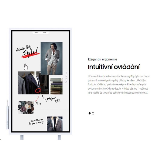 Elegantní světle šedý vzhled Samsung Flip z něj činí perfektní doplněk každého moderního pracoviště. Pyšní se ergonomickým designem s možností naklonění o 4,5 stupně. Také je vybaven pouzdrem na pero a odkládací poličkou. Flip je jednoduše připraven poskytnout vám moderní způsob působivé prezentace myšlenek i praktické pomůcky pro každodenní práci.