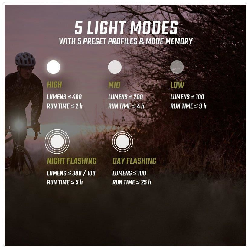 - 5 světelných režimů: High (400 lm), Mid (200 lm), Low (100 lm), Night Flashing (300/100 lm), Day Flashing (100 lm)