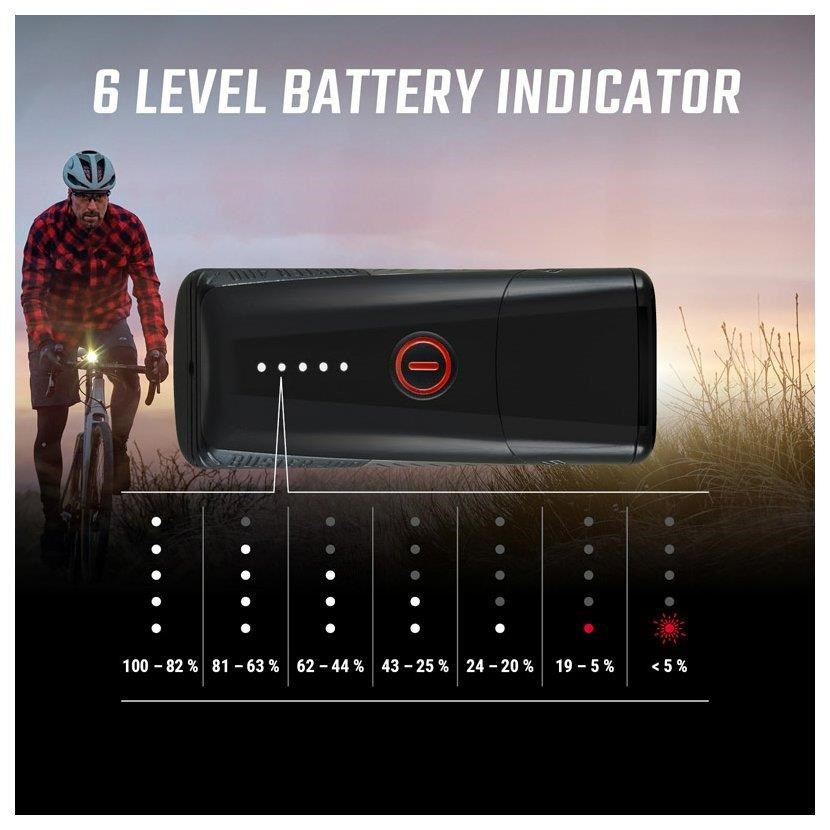 Přední světlo Buster 400 je univerzálním společníkem za snížené viditelnosti. Se světelným výkonem 400 lumenů a viditelností 120 metrů se nikdy neocitnete ve tmě. V závislosti na zvoleném světelném režimu může toto výkonné světlo svítit až 30 hodin. Pět přednastavených profilů se postará o mimořádný uživatelský komfort. Jednoduše vyberete profil vhodný do aktuálních světelných podmínek a pak pouze přepínáte mezi světelnými režimy, které v aktuálním okamžiku skutečně potřebujete. Přesné LED indikátory na horní straně ukazují, kolik energie má světlo ještě k dispozici.