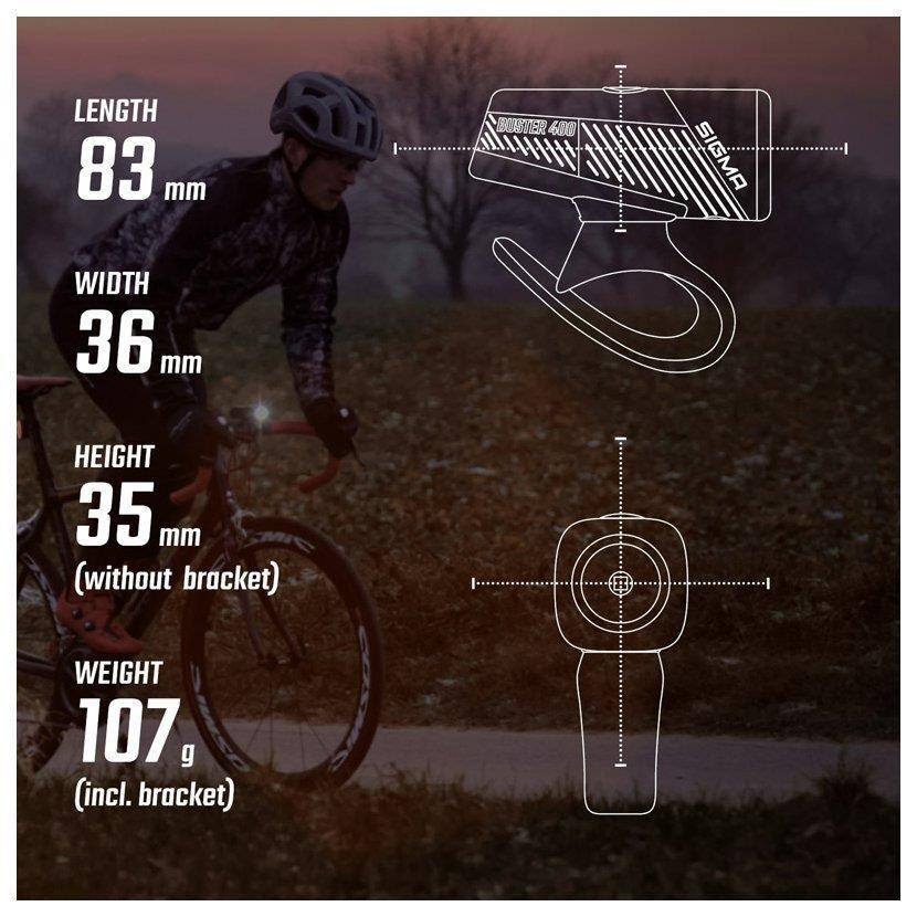 Buster 400 lze díky silikonovému držáku namontovat bez použití nářadí na řídítka během pár sekund. Podle potřeby se dá horizontálně i vertikálně vyrovnat a perfektně tak dosedne i na prohnutá řídítka. Díky integrovanému jezdci lze Buster 400 z držáku snadno sejmout a znovu nasadit. Držák na řídítka je vhodný pro řídítka o průměru 22–35 mm.