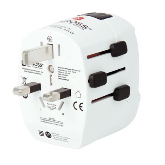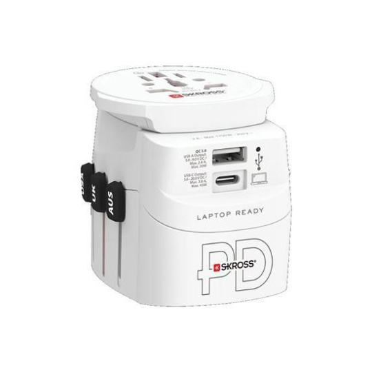 SKROSS PRO Light USB AC45PD – World zajišťuje jednoduché a bezpečné připojení zařízení ve více než 200 zemích. Podporuje dvoupólové i třípólové zástrčky a zvládne napájet výkonné spotřebiče, jako jsou notebooky či cestovní fény. Díky integrované nabíječce s porty USB-C a USB-A lze současně nabíjet více zařízení.