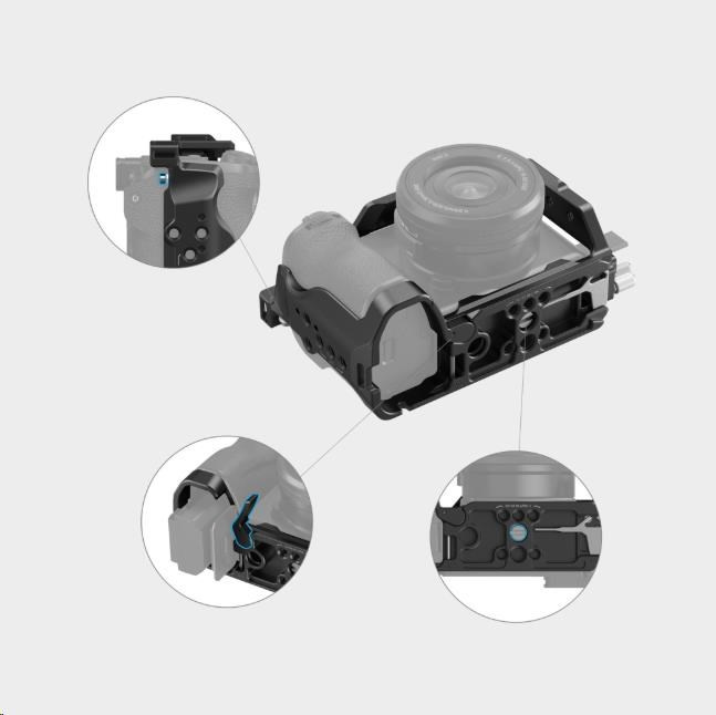 Klec má také vyhrazeny otvory na obou stranách a ve spodní části pro upevnění příslušenství, jako je ruční popruh SmallRig 3848, ramenní popruh 2428 atd.