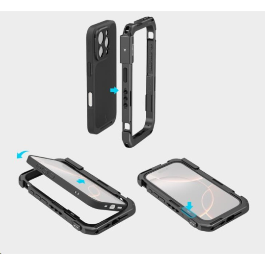 Telefon lze rychle upevnit do klece, která je vybavena několika otvory s 1/4"-20 závitem proti otočení a úchyty pro studenou patku, a rozšířit ji tak o příslušenství, jako jsou rukojeti, stativy, mikrofony a světla, což zvyšuje zážitek z fotografování, zatímco integrované rychloupínací rozhraní zajišťuje bezproblémové připojení.