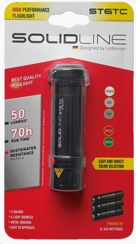 Kompaktní svítilna se šesti LED: 3x bílá (50 lm), 2x červená (10 lm), 1x zelená (10 lm)