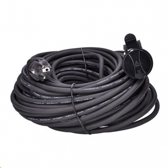 gumový kabel průřez vodičů: 3 x 1,5mm2 typ kabelu: H05RR-F3 barva: černá délka: 30m krytka na zásuvku max. 3680W, 230V/16A.