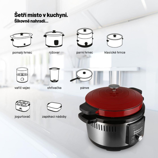 Všestranný pomocník pro moderní domácnostVíceúčelový Lauben OvenSafe® Multicooker 6000RS rozhodně nedělá ostudu svému označení. Vnitřní hrnec je poctivý litinový se smaltovaným povrchem – jako od babičky! Díky technologii OvenSafe® lze bez obav vložit do trouby či postavit na různé typy sporáků, zvládá teplotu až 250°C. Protože je 21. století v plném proudu, nádobu o objemu 6 l lze vložit i do multicookeru a rázem máte k dispozici 10 přednastavených programů pro snadné a rychlé vaření. Teplotu a čas je však možné upravit i ručně. Důležitou součástí hrnce je poklice, ta je navržená tak, aby k distribuci vlhkosti uvnitř docházelo rovnoměrně. Litina dokonale absorbuje a vede teplo a tím je vaření energeticky úspornější, smaltovaný povrch zabraňuje korozi. Jídlo připravíte snadno i v páře díky přiloženému pařáčku. Šikovnými pomocníky jsou funkce pro udržování teploty a odložený start. Manipulaci usnadňují přiložené silikonové rukavice a podložka, inspiraci přináší kuchařka.