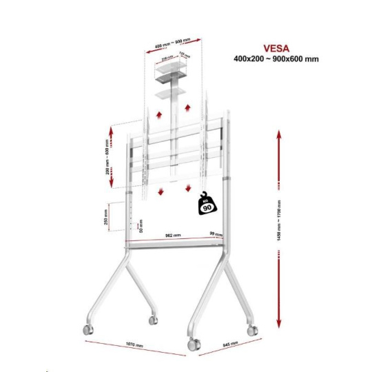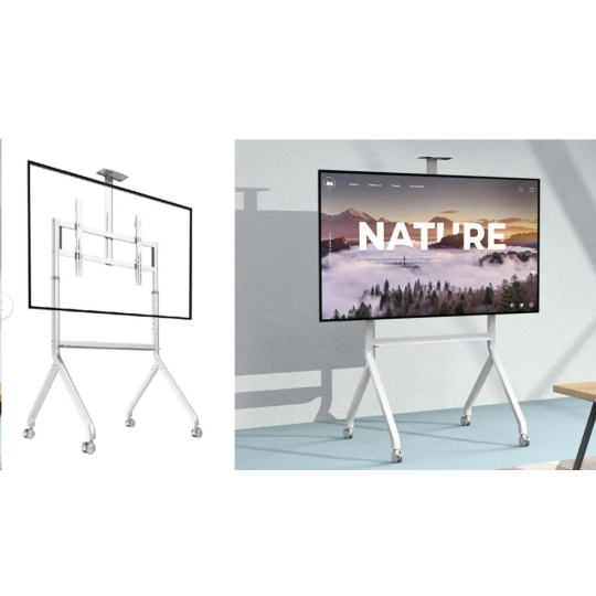 Mobilní stojan pro multimediální tabule, interaktivní monitory a LCD LED TV 60" - 100" Model: NB P200W Stojan na interaktivní tabuli / televizi / monitor NB P200W Charakteristika: Univerzální mobilní televizní vozík / stojan pro velké obrazovky Perfektní řešení pro interaktivní tabule a multimediální obrazovky Široká, stabilní základna se snadným přístupem k dotykovým obrazovkám Nastavení výšky obrazovky Vysoce kvalitní materiály mají za následek velmi pevnou a odolnou konstrukci Výškově nastavitelná police na fotoaparát, kameru nebo jinou AV techniku Přídavná police pod zástěnou na příslušenství Plná shoda se standardem VESA Jednoduchá a rychlá montáž Ideální pro konferenční místnosti, školy, výstavy i pro soukromé použití Čtyři otočná gumová kolečka s funkcí aretace Vysoká nosnost, skvělá stabilita Stojan na multimediální tabule a multimediální dotykové monitory a televize NB P200W TECHNICKÉ PARAMETRY Maximální nosnost 90,9 kg Pro obrazovky 60" - 100" Výškové nastavení v rozsahu 145 ~ 170 cm (každých 5 cm) Gumová otočná kolečka o průměru 75 mm s funkcí aretace Pevná ocelová konstrukce Nastavitelná police na fotoaparát nebo jinou AV techniku, rozměry: Rozměr 256 x 125 mm Spodní police na příslušenství, rozměry: 962 x 99 mm Povrchová úprava: práškový lak Barva: bílá Standard kompatibilní s VESA (rozteč montážních otvorů): VESA 200x200 (rozteč otvorů 200 x 200 mm) VESA 300x200 (rozteč otvorů 300 x 200 mm) VESA 300x300 (rozteč otvorů 300 x 300 mm) VESA 400x200 (rozteč otvorů 400 x 200 mm) VESA 400x400 (rozteč otvorů 400 x 400 mm) VESA 600x400 (rozteč otvorů 600 x 400 mm) VESA 800x400 (rozteč otvorů 800 x 400 mm) VESA 800x500 (rozteč otvorů 800 x 500 mm) VESA 800x600 (rozteč otvorů 800 x 600 mm) VESA 900x600 (rozteč otvorů 900 x 600 mm) VESA 200x200 ~ 900x600 mm (všechny kombinace otvorů v tomto rozsahu).