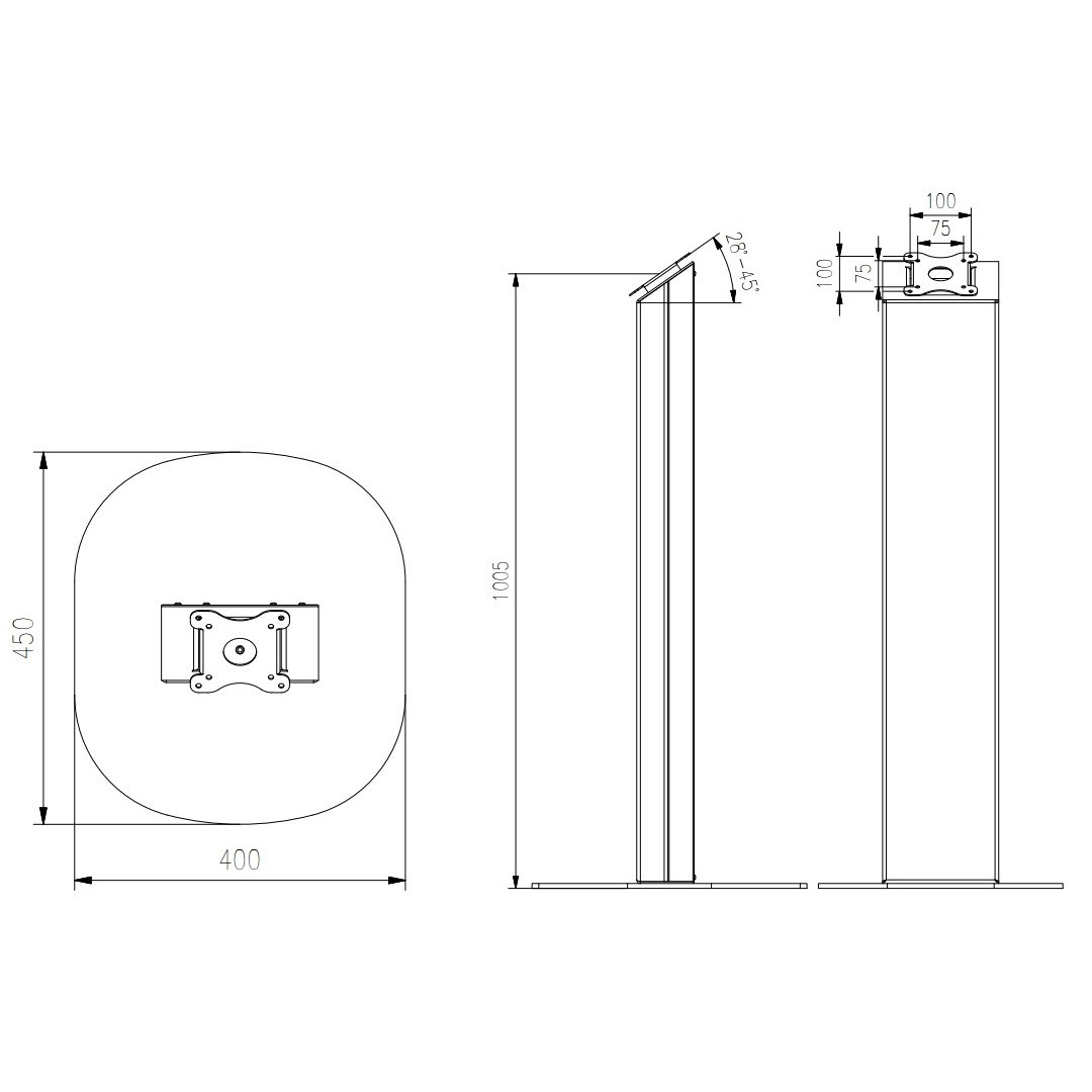 Stojan na televizi nebo monitor EDBAK ITSV03 Profesionální celokovový stojan na televize a monitory 15-43", výška 105cm, nastavitelný náklon 29-45°, skryté vedení kabeláže, skvělá stabilita, VESA 75x75 a 100x100, nosnost 8kg Profesionální stojan pro uchycení televizí, monitorů a dotykových obrazovek s úhlopříčkou 15" až 43". Stojan podporuje VESA standardy 75x75 a 100x100, výška 105cm, umožňuje regulaci náklonu obrazovky od 29° do 44°. Konstrukce je celokovová, litinový podstavec s rozměry 450x400mm poskytuje vynikající stabilitu a bezpečnost. V těle stojanu je prostor pro skryté vedení veškeré kabeláže. Nosnost 8kg. Stojan je krásného designu. Nejvyšší kvalita a estetika stojanu ITSV03 uspokojí i nejnáročnější zákazníky. Záruka 10 let. Profesionální stojan na dotykové obrazovky, monitory, tablety a EET pokladny, celokovové provedení, vynikající bezpečnost a stabilita, skryté vedení kabeláže, krásný design - EDBAK ITSV03 Technické údaje: maximální bezpečné zatížení 8kg podporuje VESA standardy 75x75 a 100x100 vhodný na klasické nebo dotykové monitory a Tv s úhlopříčkou 15" až 43" výška stojanu 1050mm možnost regulace náklonu obrazovky od 29° do 44° systém pro skryté vedení veškeré kabeláže tělem stojanu litinová podstava o rozměrech 450x400mm, otvory pro kotvení profesionální kvalita stabilní a bezpečný barevné provedení černé matné záruka 10 let Stojan na Tv monitory Edbak ITSV03 podporuje VESA standardy: VESA 75x75 VESA 100x100 za příplatek VESA 200x100 a 100x200 za příplatek VESA 200x200.
