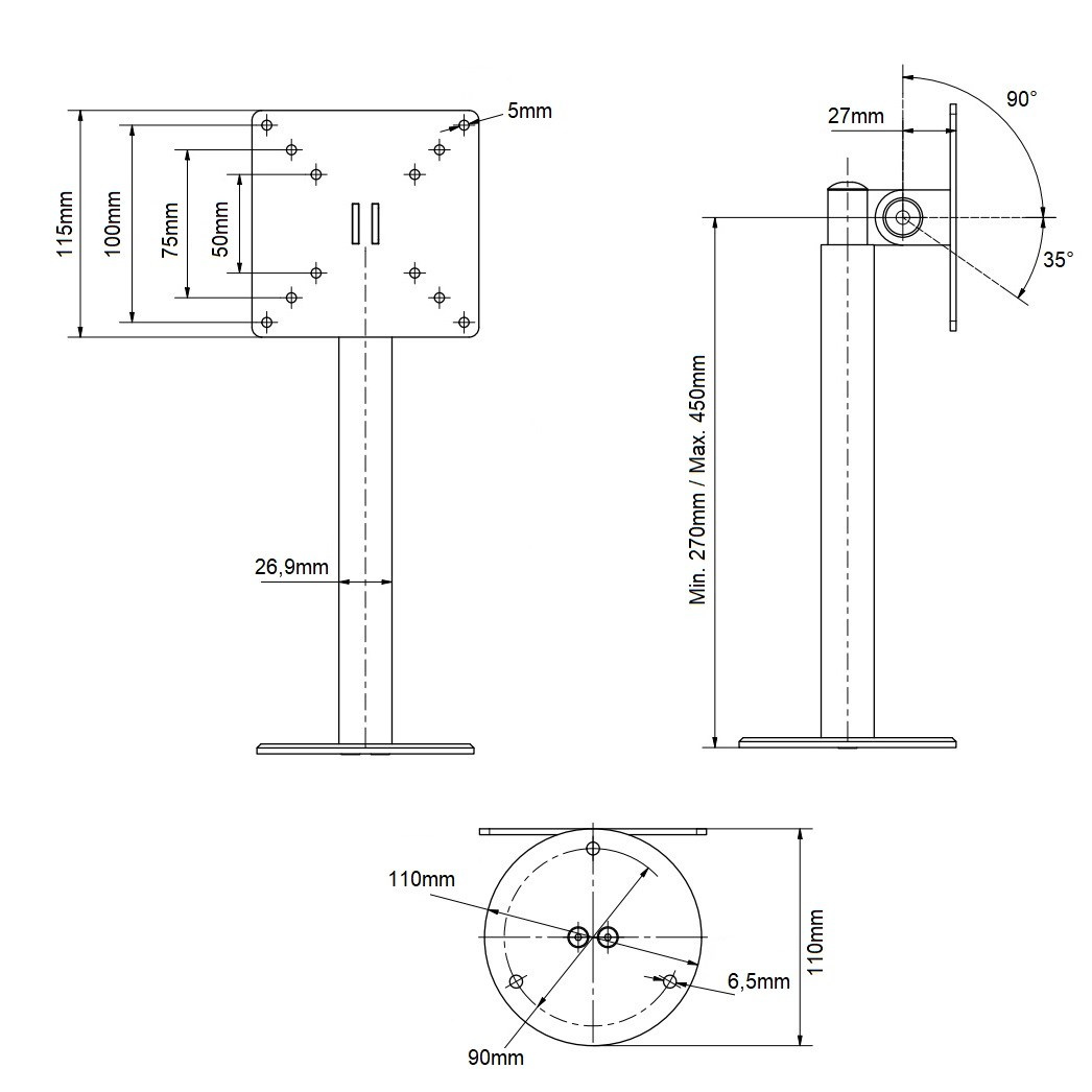 Stolní držák na dotykové monitory EDBAK SV30 Držák na Tv a monitory 15-43", nastavitelná výška 280-450mm, nastavení náklonu -30°/+90°, otáčení do stran +/-180°, 2 typy stolních úchytů, VESA 75x75 a 100x100, nosnost 10kg Stolní držák pro monitory a televize 15-43", který vyniká svou vynikající kvalitou, nastavitelností a aretací obrazovky v nastavené poloze. Nastavitelná výška v rozmezí 28-45cm od stolové desky, otočení do strany +/- 180°, naklápění ve velkém rozsahu od -30° až do +90° (obrazovka vodorovně). Držák je dodáván se 2 typy stolního uchycení - svěrák pro uchycení na okraje stolů a litinová skruž s otvory pro ukotvení do stolové desky. Držák podporuje VESA standardy 75x75 a 100x100 a má nosnost 10kg. Díky pevné konstrukci a aretace polohy je držák vhodný nejen na monitory a televize, ale i na dotykové obrazovky. Záruka 5 let. Stolní držák na monitory EDBAK SV30 Technické údaje: nosnost 10kg vhodný pro monitory, televize a dotykové obrazovky 15" - 43" podporuje VESA standardy 75x75 a 100x100 nastavitelná výška 280 až 450mm otočný +/- 360° sklopný +90°/-30° volba vhodného typu uchycení na stolovou desku - na okraj nebo do prostoru fixace v požadované poloze snadná instalace barevné provedení černé záruka 5 let Stolní držáky na monitory nebo televize Edbak SV30 Držák podporuje VESA standardy pro uchycení monitorů: VESA 75x75 VESA 100x100 Na držáky EDBAK SV30 je možné zavěsit veškeré monitory a televizory, jejichž hmotnost je maximálně 10kg a které podporují některý z výše uvedených VESA standardů. Výška televize nebo monitoru (ne úhlopříčka) nesmí být větší jak 36cm..
