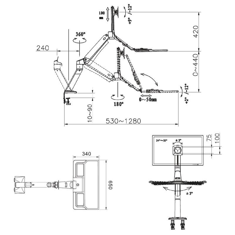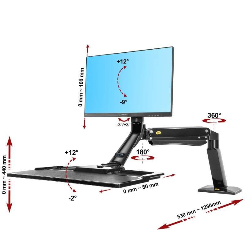 Stolní kancelářský držák monitoru a klávesnice NB FC40B Profesionální stolní držák pro uchycení monitorů 17-35" včetně police na klávesnici s myší. Plná polohovatelnost, TOP kvalita Plně polohovatelný stolní držák na monitor s policí na klávesnici a myš - pracovní stanice s nastavením výšky, možnost pracovat vsedě nebo vestoje. Držák je ideální na monitory s úhlopříčkou 17-35", které mají hmotnost v rozmezí 2-15kg (držák má plynový píst s nastavením na hmotnost monitoru pro velmi snadné a rychlé polohování). Podpora VESA 75x75 a 100x100, možnost rozšíření na 200x100 a 200x200. Uchycení na stolové desky o průměru 10-90mm, 2 typy stolních úchytů (na okraj stolu nebo do prostoru přes průchodku). Na držáku jsou integrované 2 USB porty 3.0 pro zapojení klávesnice a myši nebo jiného příslušenství. Barevné provedení černé, záruka 3 roky. Kancelářský stolní držák na monitor a policí na klávesnici s myší, plná polohovatelnost Fiber Mounts FC40B Technické parametry: Na monitory 17" až 35" Minimální zatížení držáku 2 kg Maximální zatížení držáku 15 kg Nastavení náklonu obrazovky +12°/-9° Otočné rameno o 180° Korekce roviny monitoru +3°/-3° Nastavitelná vzdálenost 530 ~ 1280 mm Rozměry police pro klávesnici 650 ~ 340 mm Výškové nastavení v rozsahu 0 ~ 440 mm Regulace nastavení sklonu klávesnice -2°/+12° 2x USB port 3.0 Podpora VESA standardu Systém vedení kabeláže Sklápěcí police na klávesnici Snadná manipulace Kvalitní zpracování Snadná montáž Hliníková slitina Barevné provedení černé Záruka 3 roky Kompatibilní se standardy VESA (rozteč montážních otvorů): VESA 75x75 VESA 100x100 možnost rozšíření na 100x200 a 200x100 možnost rozšíření na 200x200 Pracovní stanice FC40B - stolní držák na monitor s policí na klávesnici a myš, který je plně polohovatelný. TOP kvalita, snadné nastavení, krásný dizajn..