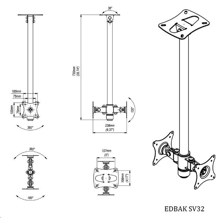 Stropní držák Tv monitoru EDBAK SV32 Profesionální stropní držák pro zavěšení 2 televizorů nebo monitorů 17-37" za sebe, výškové nastavení, otáčení, náklon, funkce PIVOT Stropní držák nejvyšší kvality pro zavěšení 2 obrazovek s úhlopříčkou 17-37". Držák umožňuje kompletní nastavitelnost - regulaci výšky, otáčení jednotlivých obrazovek do stran, náklon a rotaci - funkce PIVOT. Konstrukce je ocelová, silnostěnná. Držák podporuje VESA standardy 75x75 a 100x100, je možné zakoupit rozšíření na 200x100 a 200x200. Kabeláž je možné vést vnitřkem držáku. Vybírat můžete ve 2 barevných variatách - černé a stříbrné. Záruka 10 let. Stropní držák na nezávislé zavěšení 2 obrazovek zády k sobě - Edbak SV32 Technické údaje: maximální zatížení 20kg doporučená úhlopříčka Tv nebo monitoru 17" až 37" podporuje VESA standardy 75x75 a 100x100 za příplatek možnost rozšíření VESA standardu na 200x100 nebo 200x200 délka držáku 730mm nastavení vzdálenosti od stropu nezávislé otáčení obrazovek na obě strany +/- 90° náklon obrazovky nahoru nebo dolů +/- 60° funkce PIVOT - horizontální nebo vertikální natočení obrazovky profesionální stropní držák na 2 obrazovky materiál ocel barevné provedení černé nebo stříbrné záruka 10 let Držák podporuje VESA standardy: VESA 75x75 VESA 100x100 VESA 200x100 - za příplatek VESA 200x200 - za příplatek.