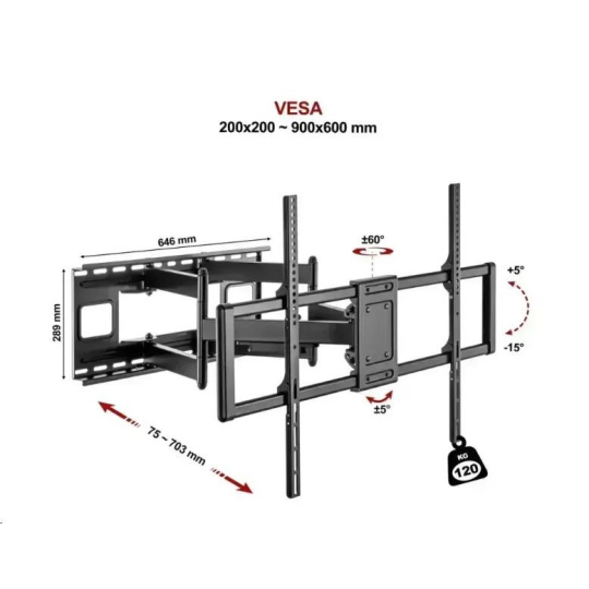 Super pevný TV držák Fiber Novelty MEGA120 Držák na TV 55" - 120", otočný +60° / -60°, sklopný +5° / -15°, vzdálenost od zdi 75 - 703mm, korekce roviny +5° / -5°, instalační materiál, šablona i minivodováha, VESA standardy 200x200 až 900x600, nosnost 120kg Představujeme Fiber Novelty MEGA120, revoluční držák na televize, který přináší nevídanou flexibilitu a bezpečnost pro vaši domácí zábavu. S možností instalace televizorů od 55" až do neuvěřitelných 120", tento držák je navržen tak, aby vyhovoval široké škále potřeb a preferencí. Jeho robustní konstrukce zajišťuje, že váš televizor bude v bezpečí a stabilní, zatímco unikátní otočný a sklopný mechanismus nabízí široké možnosti pro nastavení optimálního pozorovacího úhlu. MEGA120 držák na televize s nosností 120kg a VESA 200x200 až 900x600 Fiber Novelty MEGA120 je vyroben s ohledem na nejvyšší standardy kvality a pečlivě vybraný instalační materiál zaručuje snadnou a rychlou instalaci. Díky širokému rozsahu VESA kompatibility od 200x200 až po 900x600 je tento držák ideální volbou pro téměř každý televizor na trhu. Navíc s nosností až 120kg můžete být jisti, že váš televizor je v bezpečí. Využijte plný potenciál vašeho televizoru s Fiber Novelty MEGA120 a transformujte svůj obývací pokoj na ultimátní centrum domácí zábavy. Ať už sledujete svůj oblíbený film, děti si užívají kreslené, nebo hostíte sportovní večer s přáteli, tento držák se postará o nezapomenutelný zážitek pro všechny. Profesionální extrémně pevný držák na velké televize MEGA120 Technické údaje: nosnost 120 kg na televize, monitory a displeje s úhlopříčkou 55" - 120" podporované VESA standardy 200x200 až 900x600 nastavení vzdálenosti od zdi 75 - 703mm otáčení do stran až +60° / -60° naklápění obrazovky +5° / -15° korekce roviny +5° / -5° vynikající extrémně pevná konstrukce úchytky na kabely instalační materiál a šablona, minivodováha hmotnost samotného držáku (bez Tv) cca. 15kg barevné provedení černé záruka 3 roky Nastavitelná vzdálenost od zdi od 75 do 703 mm na držáku TV MEGA120 Držák Tv MEGA120 podporuje tyto VESA standardy: VESA 200x200 VESA 300x200 a 200x300 VESA 300x300 VESA 400x200 a 200x400 VESA 400x300 a 300x400 VESA 400x400 VESA 600x400 a 400x600 VESA 600x600 VESA 800x400 VESA 800x600 VESA 900x500 VESA 900x600.