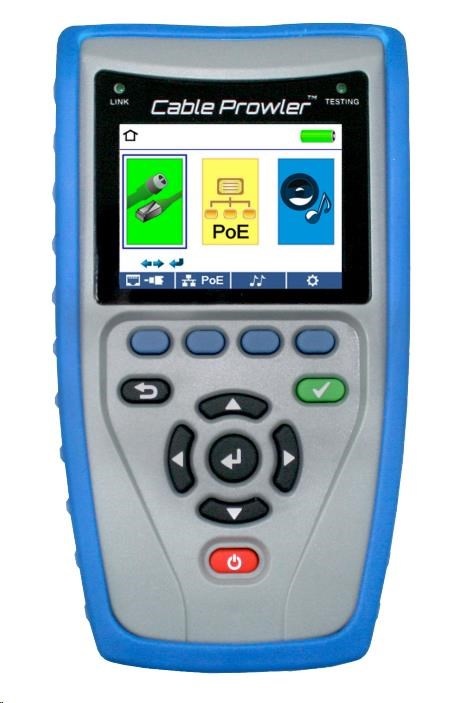 - Testuje ethernet a kotroluje konektivitu včetně testů pro zkraty, přehozené páry, špatně zapojené páry, neukončené kabely