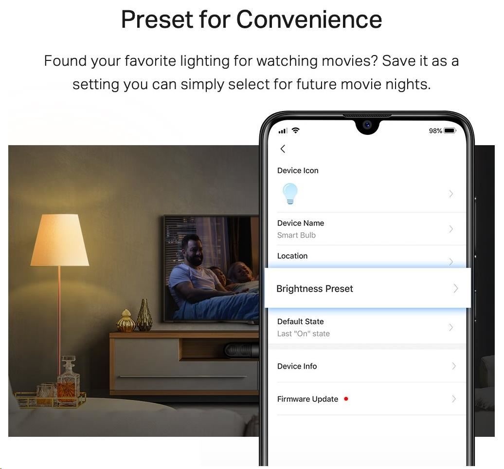 • Stmívatelná (nastavení pro vaše pohodlí) – Našli jste své oblíbené osvětlení pro sledování filmů? Uložte jej jako nastavení, které si můžete jednoduše vybrat pro budoucí filmové noci