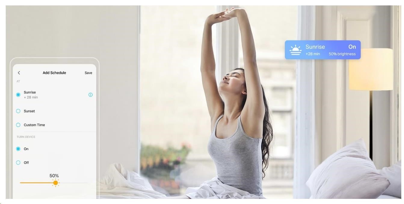 Vytvořte si pravidelný plán pro zapnutí/vypnutí s nastaveným jasem. Režimy východu a západu slunce umožňují automatické zapnutí světla podle vaší časové zóny.