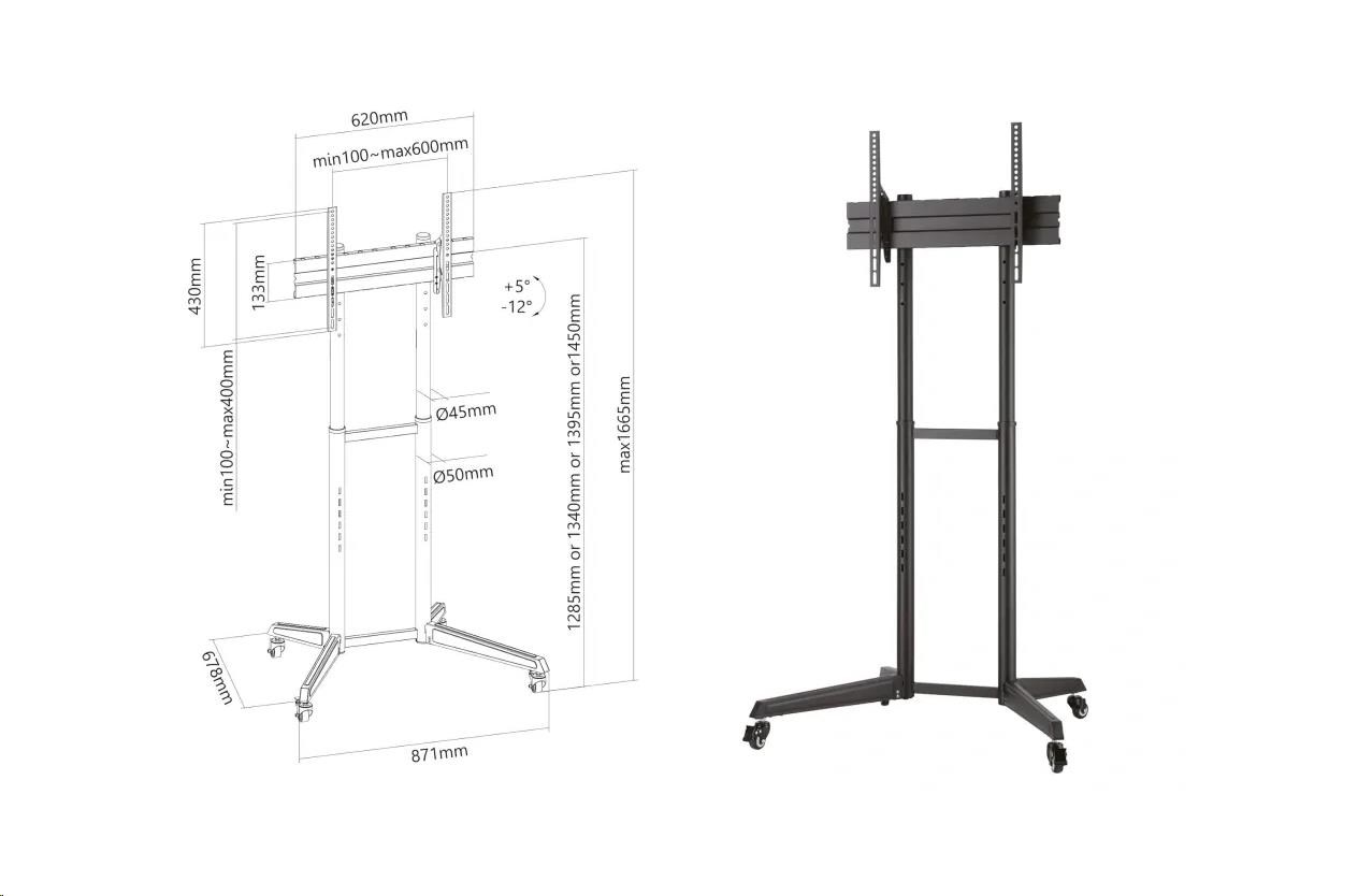 Tv stojan s kolečky, nastavením výšky a náklonu, na televize 37" - 70", výška 1285 / 1340 / 1395 / 1450 mm, náklon +5° / -12°, kolečka s aretací, podstava 871x678 mm, systém pro vedení kabeláže, instalační materiál, podporuje standardy VESA 100x100 až 600x400, nosnost 50 kg Kvalitní stojan na televize a monitory s naklápěním kolečky a nastavením výšky Fiber Mounts LUTAR-1 Potřebujete dát televizi nebo monitor na pojízdný stojan a nechcete utrácet majlant? Chcete mít možnost upravit si výšku obrazovky a mít možnost změnit úhel sklonu? Tak v tom případě pro Vás máme skvělé řešení: televizní stojan Fiber Mounts LUTAR-1, který vše splňuje na 100%. Pojízdný stojan s kvalitními kolečky s aretací, s výbornou stabilitou, který podporuje VESA standardy od 100x100 do 600x400 a spolehlivě unese zařízení s hmotností až 50 kg Vám umožní upravit výšku i náklon obrazovky. Konstrukce umožňuje skryté vedení kabeláže. Kvalitní vypalovaná černá barva. V balení naleznete montážní materiál. Na stojan poskytujeme záruku 5 let. Pojízdný stojan s nastavením výšky a náklonu Tv / monitoru Fiber Mounts LUTAR-1 Technické údaje: nosnost 50 kg podpora VESA 100x100 až 600x400 držák na televize / monitory 37" - 70" nastavitelná výška 1285 mm / 1340 mm / 1395 mm / 1450 mm nastavení náklonu obrazovky +5° / -12° podstava 871x678 mm pojezdová kolečka s aretací systém pro skryté vedení kabeláže kvalitní konstrukce barevné provedení černé záruka 5 let.