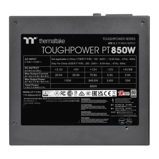 Toughpower PT 850W Platinum je kompatibilní s ATX 3.1, má certifikaci 80 PLUS Platinum a podporuje nativní PCIe Gen 5.1 (12+4pin) pro napájení nové generace grafických karet. Poskytuje 850 W nepřetržitého výkonu při 40 °C.