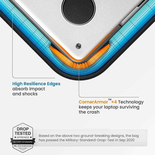 Váš notebook v něm bude jako v bavlnce chráněn měkkou plyšovou podšívkou a silným polstrováním. O jeho bezpečí se dále postará patentovaná technologie CornerArmor, posílená konstrukce rohů a hran. To, že je na ní opravdu spoleh, dokazuje i úspěšné testování odolnosti při pádech podle vojenských standardů. Tomtoc vás neochudí ani o vymazlené detaily, jako jsou ochranný hřeben kolem zipu, prémiové zipy YKK, praktická přední kapsa či popruh na Airtag.