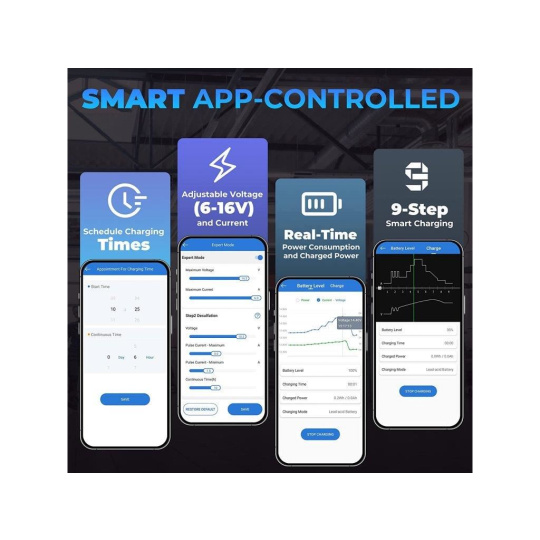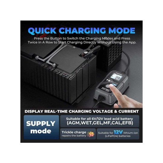Kompatibilní se všemi typy 6V a 12V olovo-kyselinových baterií a 12V lithiových baterií (LiFePO4). Podporuje i více typů baterií: LI, zaplavené, gelové, MF, CAL, EFB, AGM.