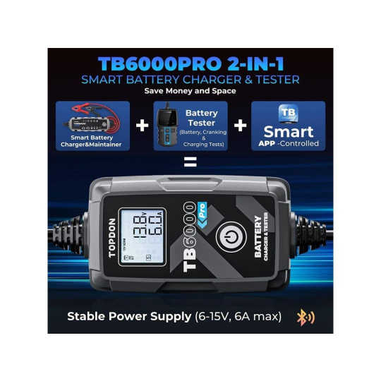 TB6000Pro podporuje podrobné testy nabíjení a 'cranking' testy pro 12V a 24V a poskytuje vynikající diagnostiku baterií prostřednictvím mobilní aplikace.