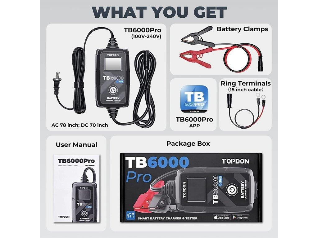 TB6000Pro podporuje podrobné testy nabíjení a 'cranking' testy pro 12V a 24V a poskytuje vynikající diagnostiku baterií prostřednictvím mobilní aplikace.