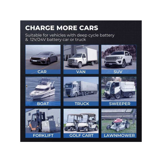 Díky podpoře 6V, 12V a 24V baterií je tato nabíječka vhodná pro více typů baterií, včetně AGM, LI WET, GEL, MF CAL a EFB!