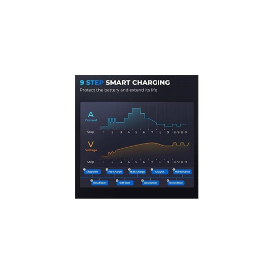 9stupňové chytré nabíjení poskytuje silnou ochranu baterie a automatický systém odpojení eliminuje risk přebití. Používejte NORM (běžné)/COLD (v chladu)/REPAIR (oprava) módy, abyste se přizpůsobili potřebám Vaší baterie, a tím prodloužili její životnost.