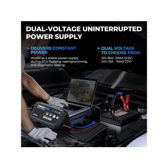 Tornado 30000 také funguje jako stabilní napájecí zdroj pro 12V a 24V zařízení! Napětí vozidla můžete udržovat na 12 V, abyste zabránili vybití při provádění oprav. S Tornado 30000 tak získáte bezpečný napájecí zdroj, který se vyhýbá provozním zpožděním, nestabilitě zařízení a poruchám.