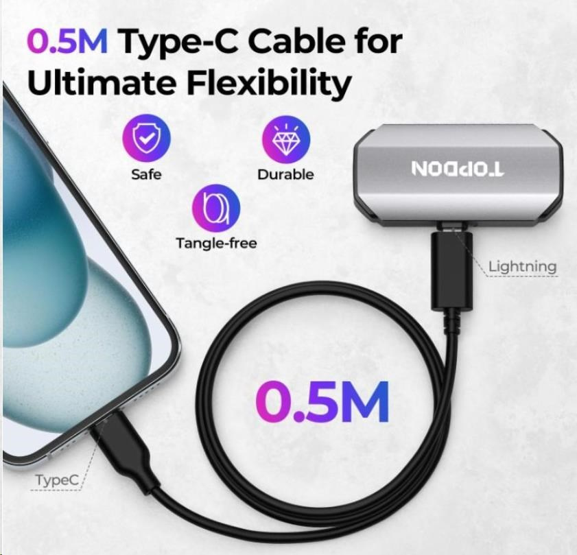 TOPDON kabel je vybavený adaptérem pro připojení zařízení s koncovkou Lightning na USB-C. Umožní vám snadno propojit TC002 s iPhonem nebo iPadem, které jsou vybaveny Type-C rozhraním.